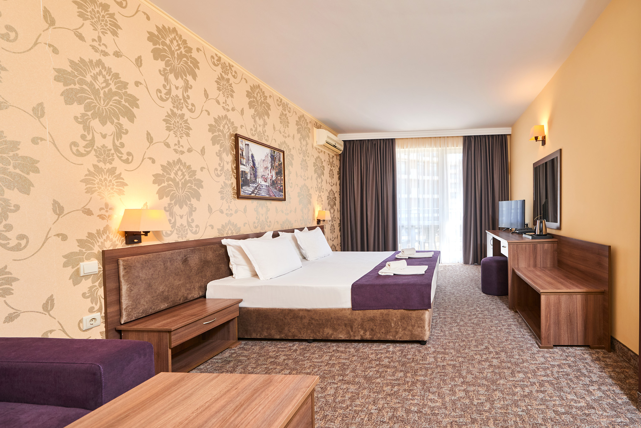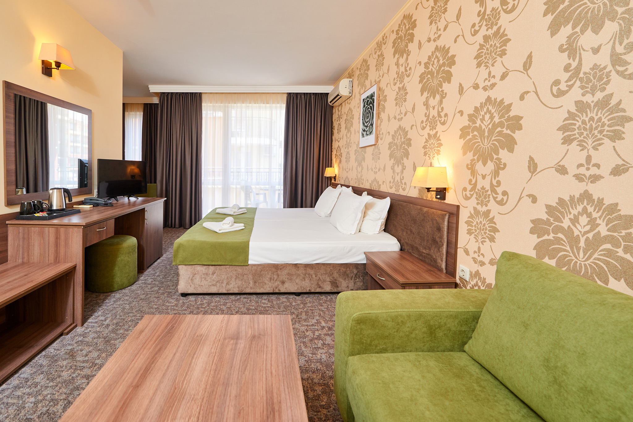 В стите: климатик, телевизор, хладилник, кът за сядане, сейф , баня с душ кабина,тоалетни принадлежности и сешоар,
